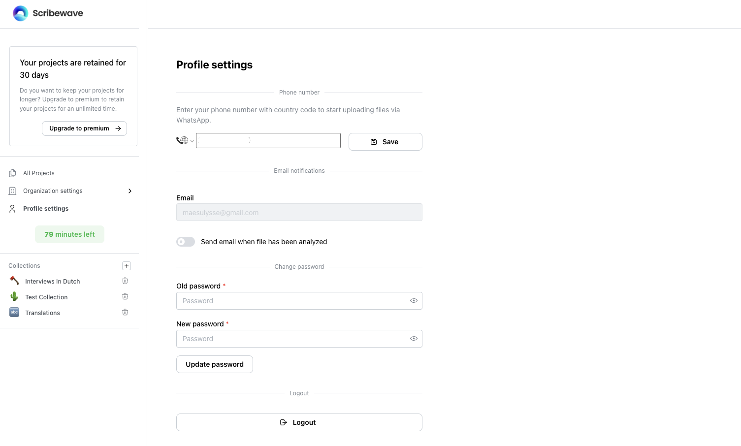 Pour utiliser le bot WhatsApp, accédez aux paramètres de votre profil, entrez votre numéro de téléphone et enregistrez. Vous recevrez un message du bot Scribewave, après quoi vous pourrez simplement lui envoyer des fichiers chaque fois que vous aurez besoin d'une transcription.