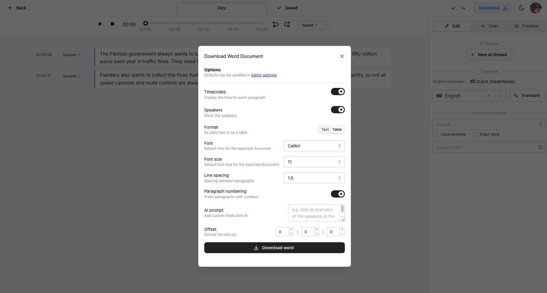 Téléchargez votre transcription traduite dans votre format préféré, tel qu'un document Word avec des codes temporels ou un fichier de sous-titres, ce qui facilite son partage ou son utilisation dans d'autres applications.